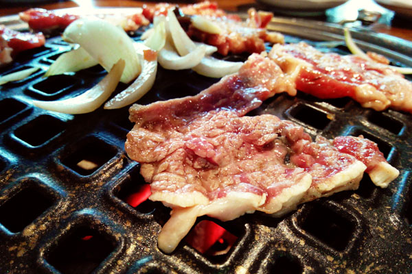 两种最有爱的食物,在我看来是生菜卷着五花肉,牛扒卷着泡菜。用不同的时间烤不一样的肉,用相同的时间把它们一刀刀剪好。蘸着酱料卷进生菜,嫩度刚好卷进泡菜,都是夹起进了你的胃,多好。吃五花肉一定要烤到微焦,憋出肥油,何况是抹了豆豉酱的五花上将,取的是最瘦的猪五花,咬的是去了肥腻的胶质感,蘸两下番茄甜辣酱,包一层生菜,风味的确独特。泡菜牛扒一份是三团,每一团都很厚,吃它的方法也好多,有人喜欢把一团摊开来烤后再剪,也有人像我喜欢费些力气,剪开厚厚一团,把泡菜和牛扒一起剪断,这样在火上待的时间短,肉也不容易老。