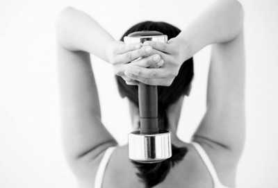 2.颈后屈伸。双脚一只略前一只略后站立,双手握住同一个哑铃的手柄,缓慢抬起哑铃过头,然后伸直胳膊让哑铃另一端朝向天花板,然后缓慢弯曲双肘,让哑铃下降到脑后部,保持上臂不动,并与地面垂直,肩胛骨向下压,保持20秒。